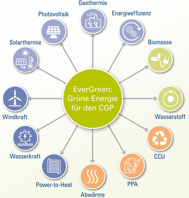 Auch InfraServ Gendorf stellt sich dieser Aufgabe – nicht zuletzt, um die steigende Nachfrage der Standortkunden nach klimaneutralem Dampf und Medien wie z.B. Sauerstoff zu bedienen. Da der Großteil der Treibhausgasemissionen der ISG durch den eigenen Stromverbrauch sowie die Lieferung von Prozessdampf an die Standortkunden entsteht, besteht vor allem hier Handlungsbedarf. Deshalb wurde im März 2021 das Projekt „EverGreen“ ins Leben gerufen. In diesem Projekt entwickeln fünf Mitarbeiterinnen und Mitarbeiter langfristige Strategien und Konzepte zur klimaneutralen oder emissionsarmen Erzeugung von Strom und Wärme, die Zukunftspotential für den Einsatz im Chemiepark haben.