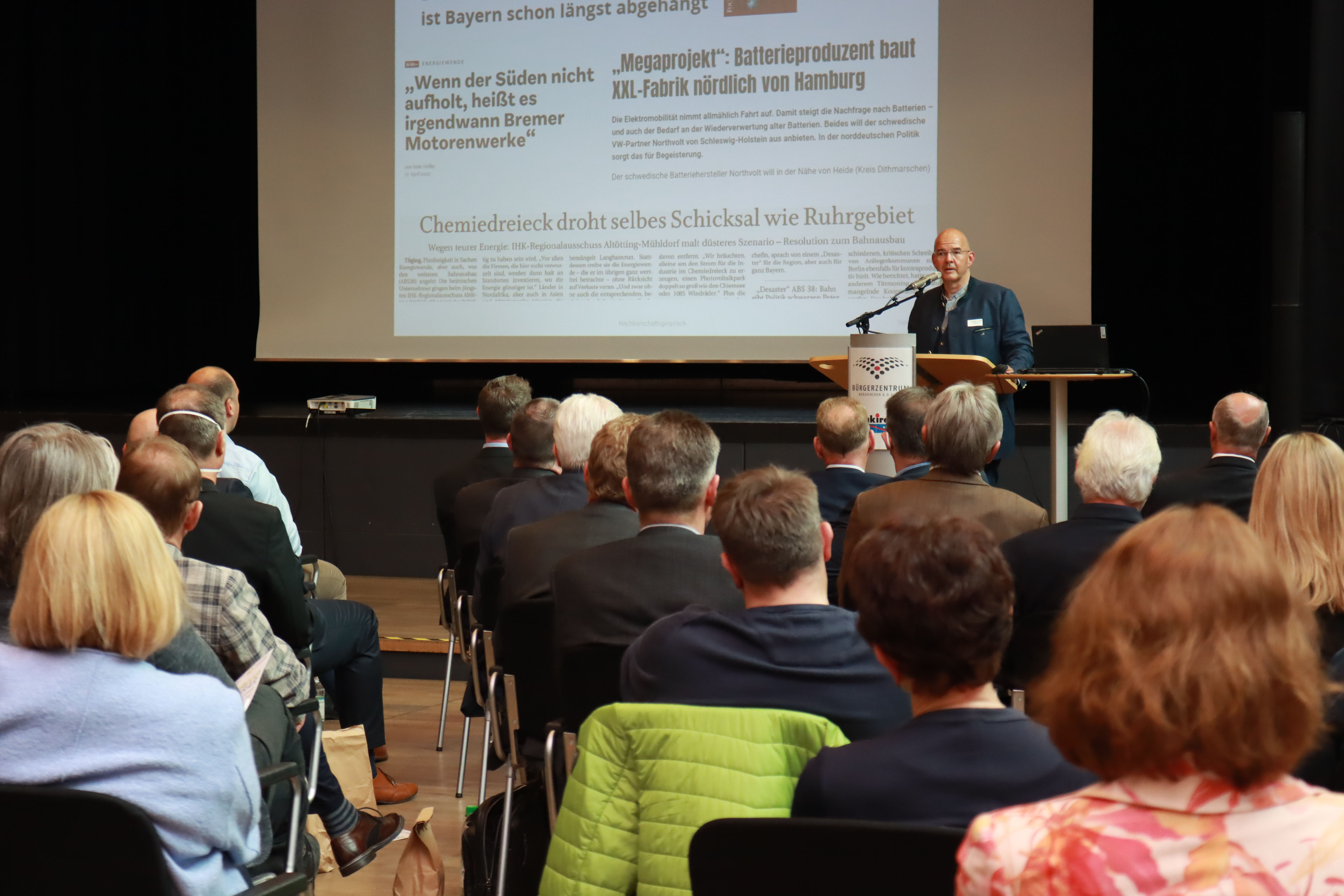 Gut gefüllt war der Saal im Burgkirchener Bürgerzentrum. Damit trotz der hohen Teilnehmerzahl Corona-Abstände eingehalten werden konnte, fand das Nachbarschaftsgespräch ausnahmsweise nicht im Chemiepark statt.