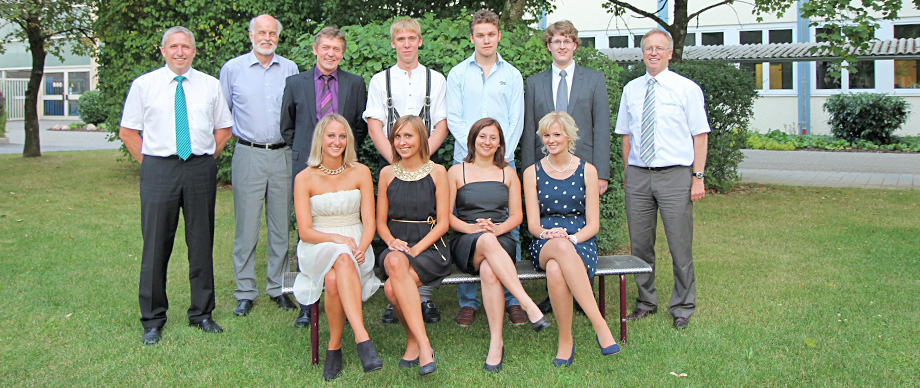 Die Besten ihres Jahrgangs: v.l. hinten: Bildungsakademieleiter Herbert Prost, Dr. Peter Blickle (Clariant), Albert Brunnbauer (Berufliche Schulen Altötting), Korbinian Forster, Thomas Warmke, Sebastian Spirkl, Dr. Bernhard Langhammer (Geschäftsleitung InfraServ). Vordere Reihe v.l.: Julia Nieder, Maria Bauer, Marina Gaßner, Evelyn Wimmer. (Foto: InfraServ Gendorf)