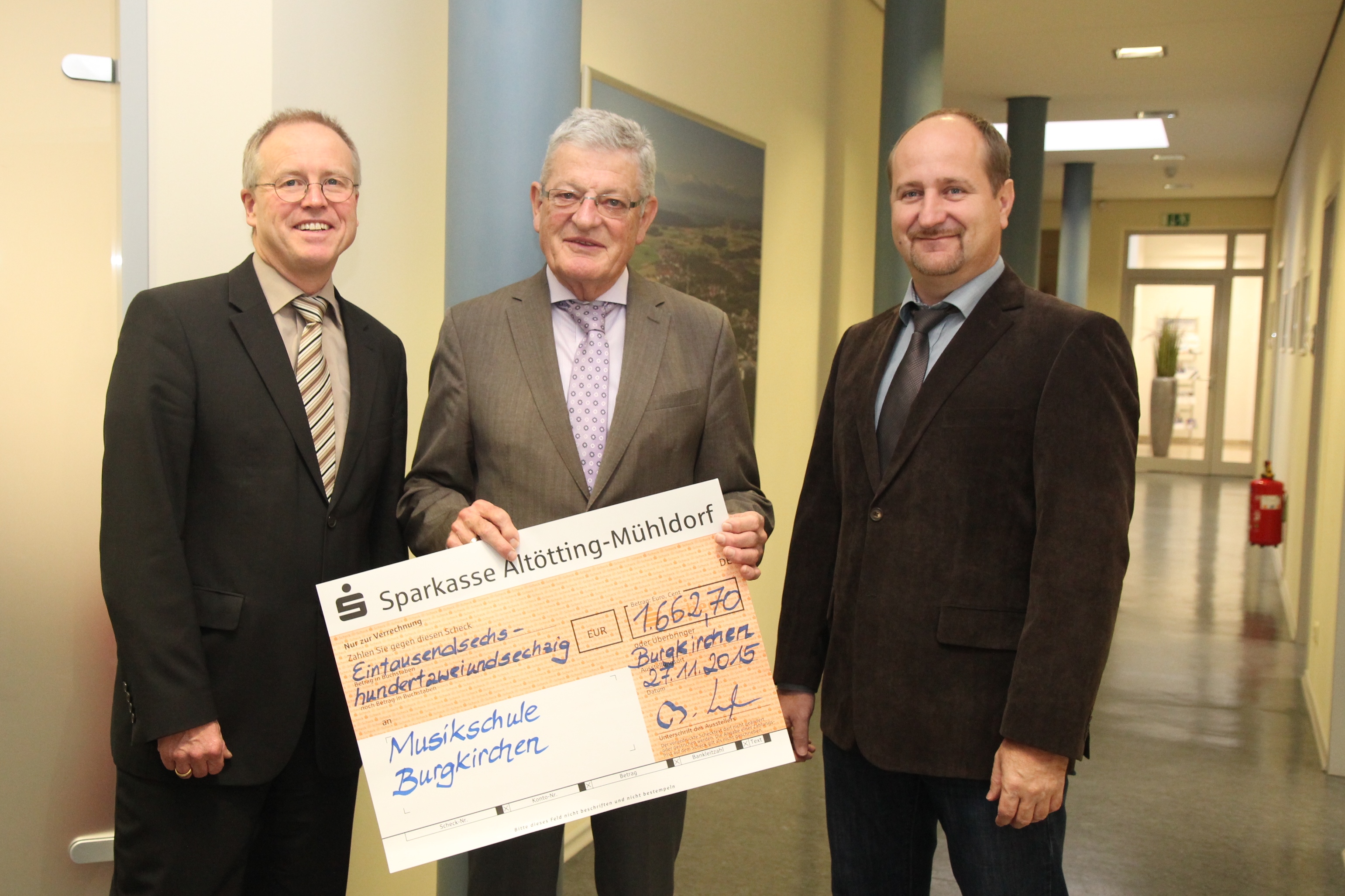 Vereinsvorsitzender Dr. Hans-Rainer Kröller (Mitte)  freut sich über  den Spendenscheck der InfraServ Gendorf für die Musikschule Burgkirchen. Mit auf dem Bild: Klemens Wimbauer (r.,Dirigent des Symphonischen Blasorchesters Werk Gendorf) und Dr. Bernhard Langhammer (l., Geschäftsleiter InfraServ Gendorf).