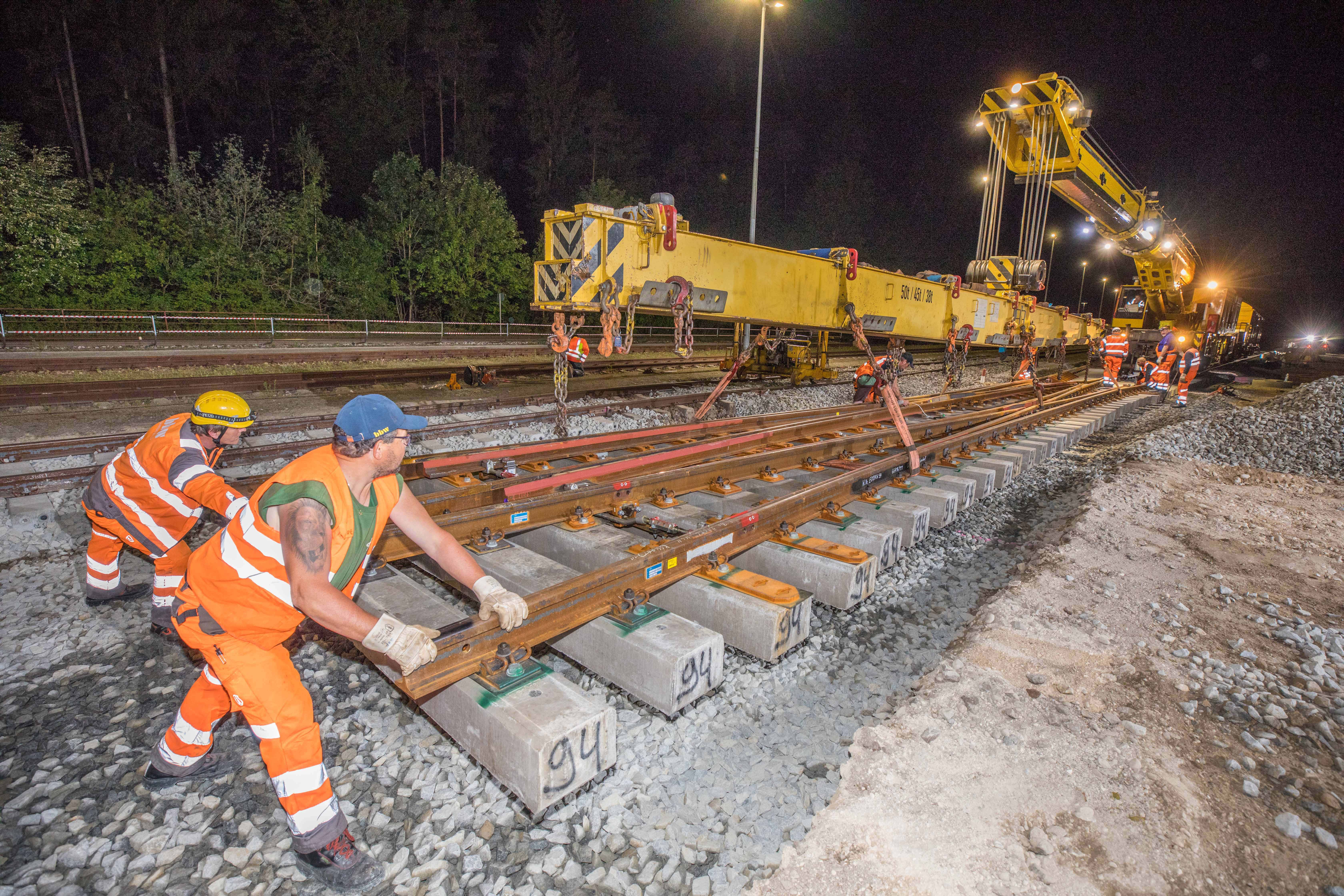Vorsichtig wird ein Weichensegment mit einem Gleisbaukran abgesenkt. Der Einbau findet nachts statt, damit es zu möglichst wenigen Unterbrechungen im Zugverkehr kommt.
