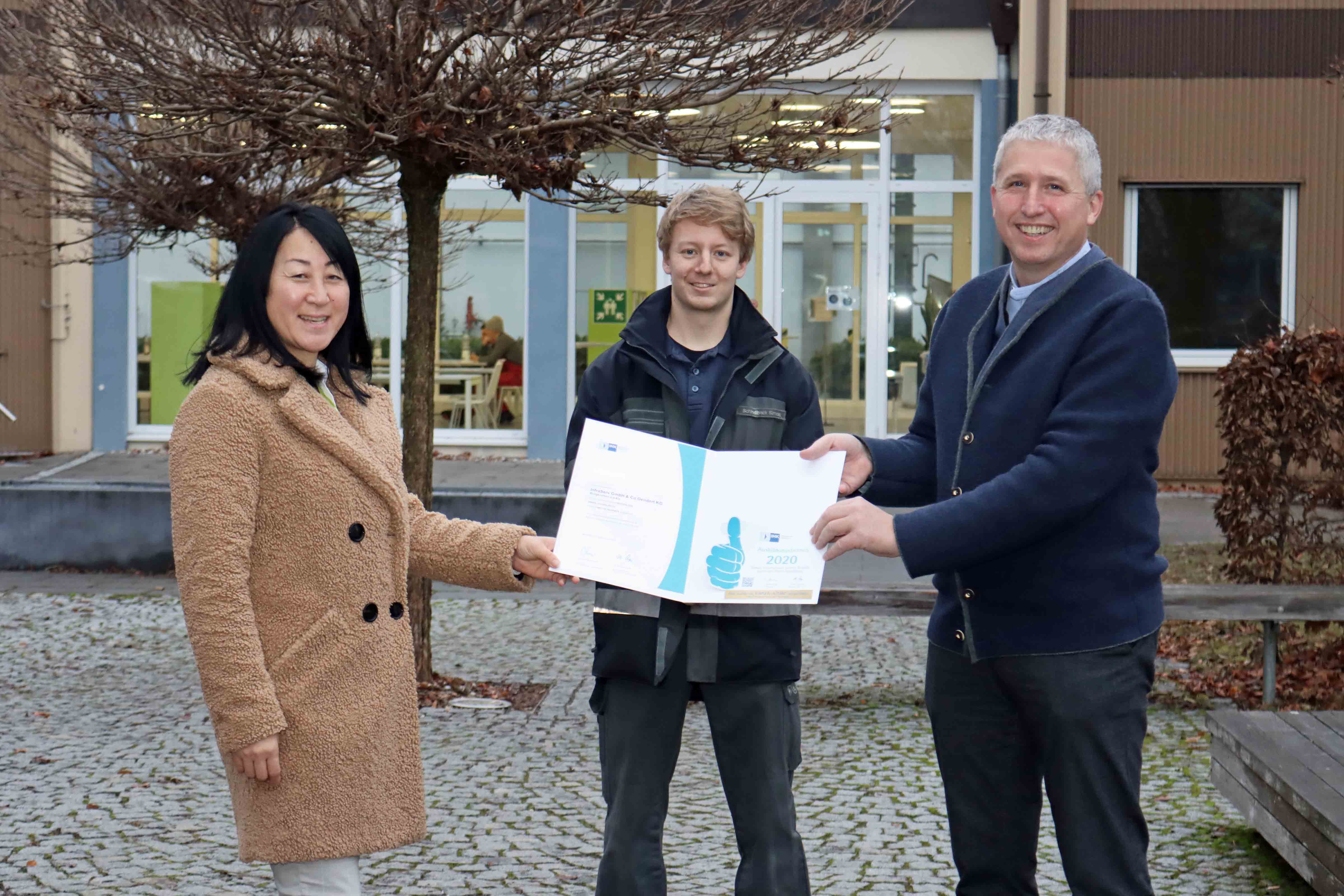 InfraServ Gendorf wurde als Ausbildungsbetrieb von Top-Azubi Simon Schindlbeck (Mitte) geehrt: Herbert Prost (rechts), Leiter der IHK-Geschäftsstelle Mühldorf überreichte ISG-Personalleiterin Eva Renner eine Urkunde zur Anerkennung.