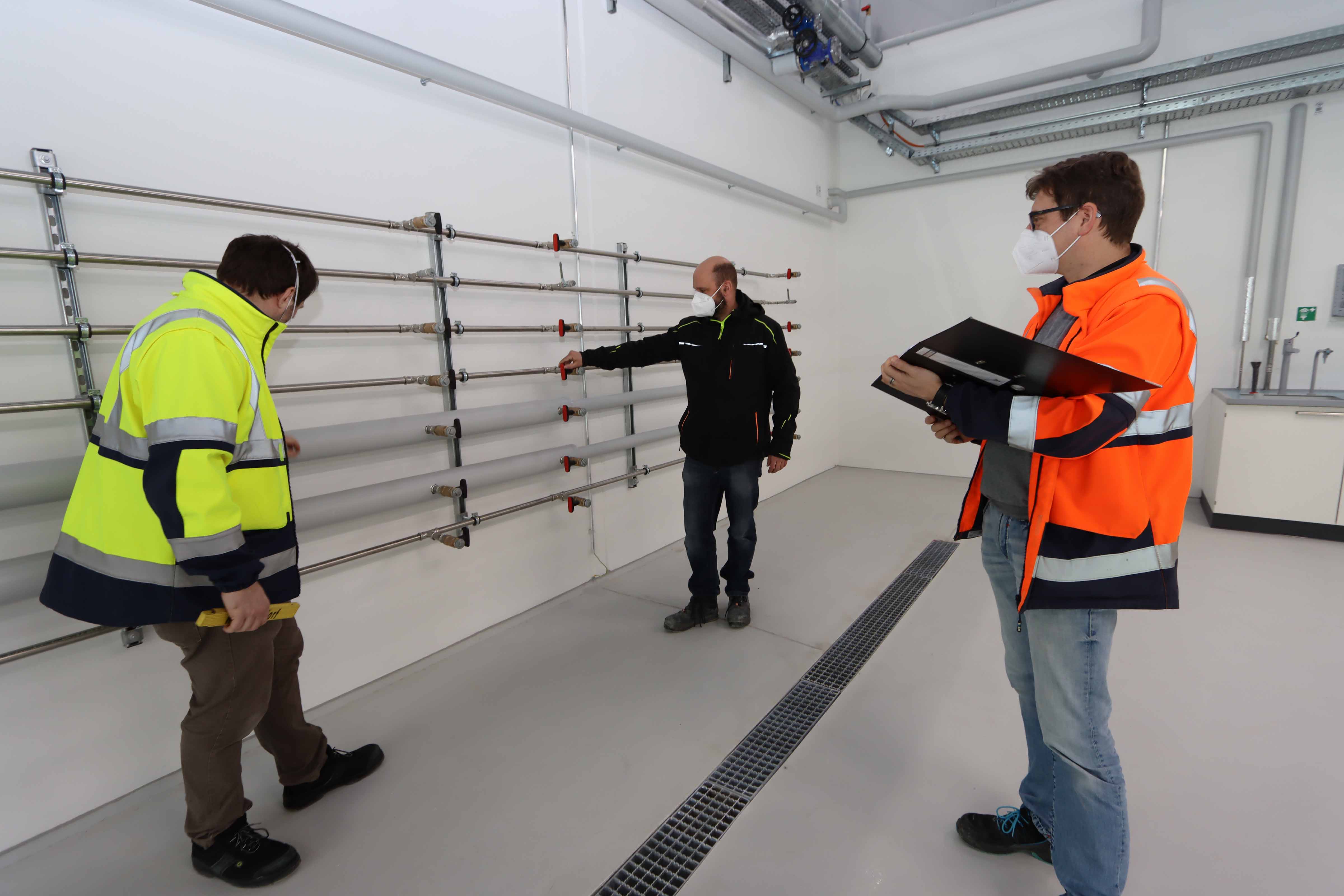 Kritischer Blick zum Abschluss: ISG-Bauprojektleiter Martin Hartmetz (rechts), Goldbeck-Projektleiter Andreas Dauner (Mitte) und Daniel Thomele, Ausbilder bei BIT Gendorf prüfen bei der Abnahme Rohrleitungen. Später werden durch diese Rohre Versorgungsmedien für die Anlagen, wie zum Beispiel Dampf, fließen.