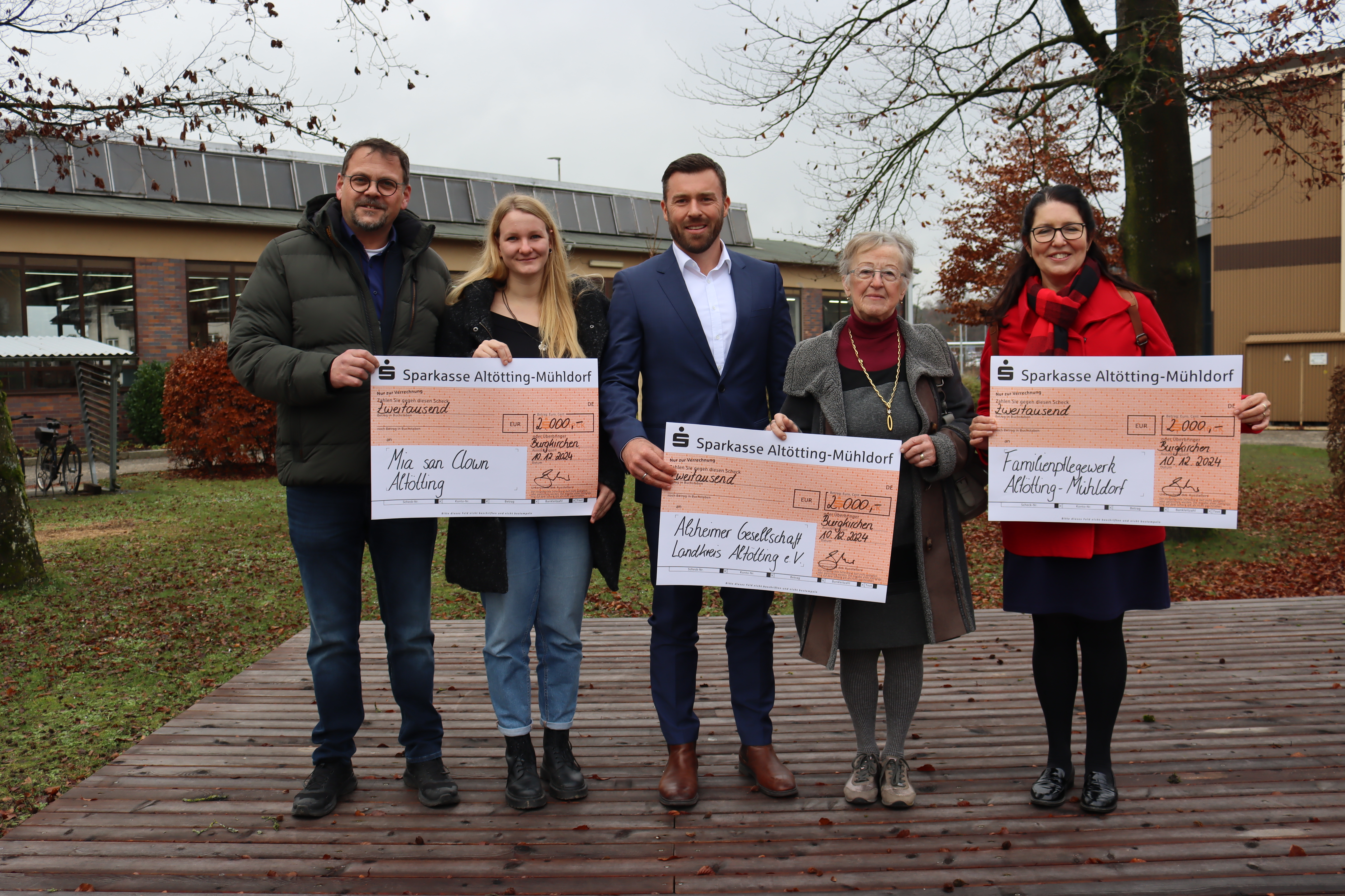 Unterstützung für Junge, Alte und Familien, darüber freuten sich (v.l.) Hubertus Sterflinger und Cornelia Englmeier („Mia san Clown“), die von ISG-Geschäftsleiter Dominik Gschwendtner (m.) ihren Spendenscheck ebenso entgegennahmen wie Maria Lehner (Alzheimergesellschaft Altötting) und Franziska Rauschecker (Familienpflegewerk).