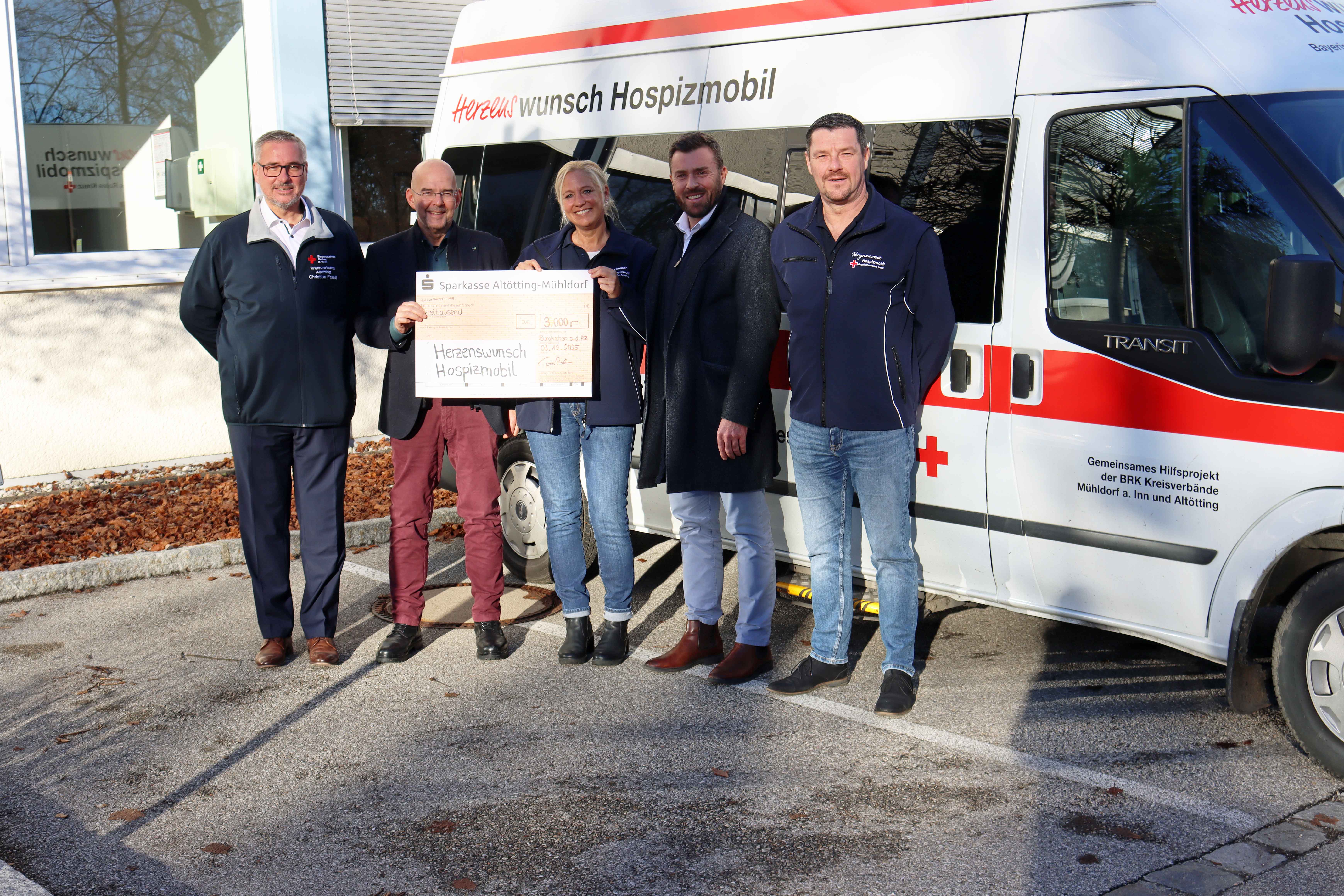 Spendenübergabe für das Herzenswunsch Hospizmobil: (von links) Christian Fendt (Kreisgeschäftsführer BRK AÖ), Dr. Christoph von Reden (ISG), Tina Buchner (BRK Mühldorf), Dominik Gschwendtner (ISG) und Jürgen Sollfrank (Kreisgeschäftsführer BRK MÜ).