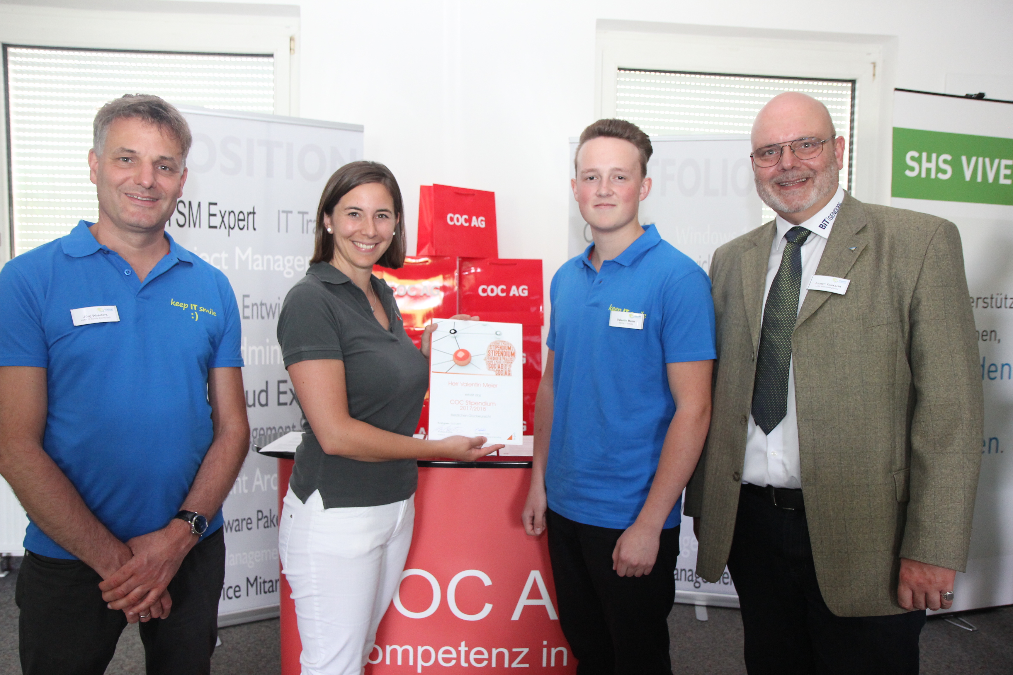 Eva-Maria Ecker, zuständig für Personalentwicklung & Recruiting bei der COC AG in Burghausen konnte an IT-Schüler Valentin Meier das erste IT-Stipendium der COC AG vergeben. Darüber freuten sich auch Akademieleiter Jochen Volbracht (re.) und Jörg Wanders, Leiter der IT-Schule Gendorf.