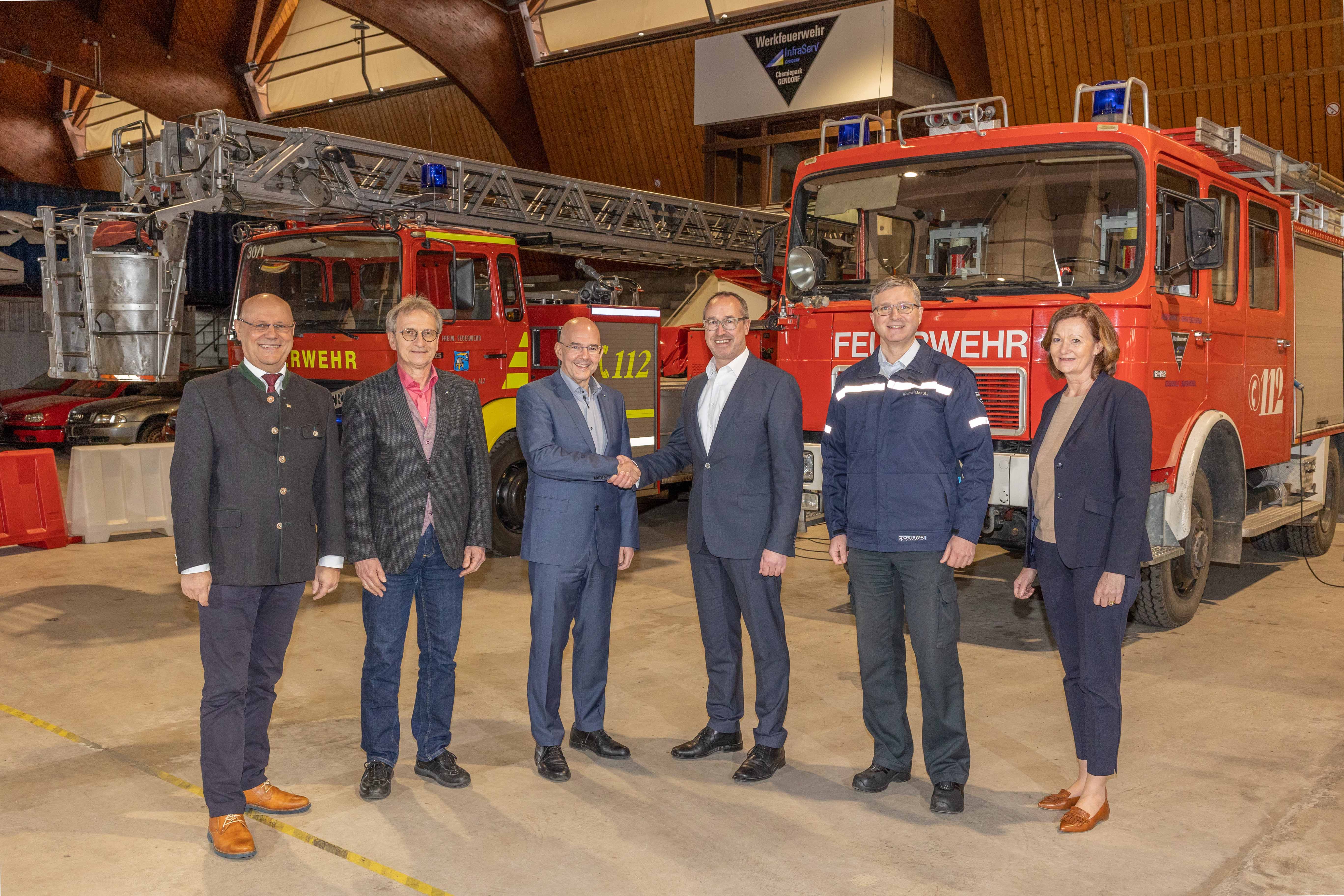 Im Bild v.l.n.r.: Johann Krichenbauer, Bürgermeister Burgkirchen, Alfred Sandner, Prokurist InfraServ GmbH & Co. Gendorf KG, Dr. Christoph von Reden, Geschäftsleiter InfraServ Gendorf, Ernst Steuger, COO der Nürnberger Wach- und Schließgesellschaft mbH, Alfred Kronwitter, Leiter der Werkfeuerwehr InfraServ Gendorf, Ellen Heutling, Leiterin Marketing/Vertrieb Nürnberger Wach- und Schließgesellschaft mbH.